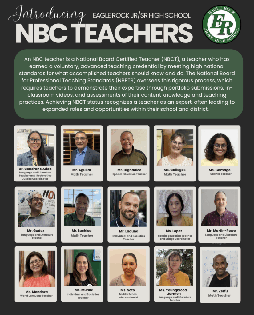 Did you know that Eagle Rock Jr/Sr High School has 15 NBC teachers? National Board Certification is the most respected professional certification available in education and provides numerous benefits to teachers, students, and schools. It was designed to develop, retain, and recognize accomplished teachers and to generate ongoing improvement in schools nationwide.