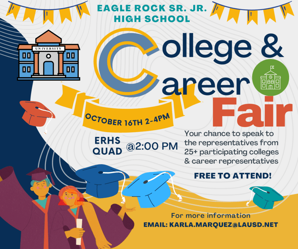 The Annual ERHS College & Career Fair will take place this Thursday, 10/16, from 2:00 p.m. to 4:00 p.m. on the Quad. This is an opportunity to speak with representatives from over 25 colleges and career representatives. See flyer for details. For more info email karla.marquez@lausd.net.