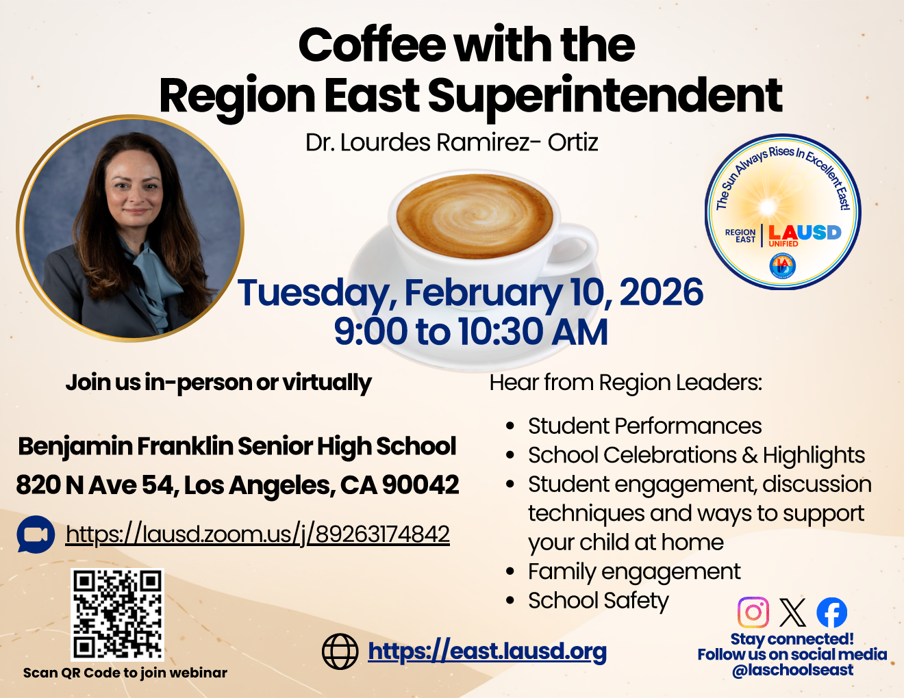 Start your morning with Region East Superintendent Dr. Lourdes Ramirez-Ortiz for coffee, conversation, and important updates regarding school safety and student engagement.