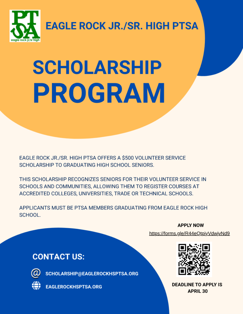 Eagle Rock Jr./Sr. High PTSA offers a $500 Volunteer Service Scholarship to graduating high school seniors. This scholarship recognizes seniors for their volunteer service in schools and communities, allowing them to register for courses at accredited colleges, universities, trade, or technical schools.