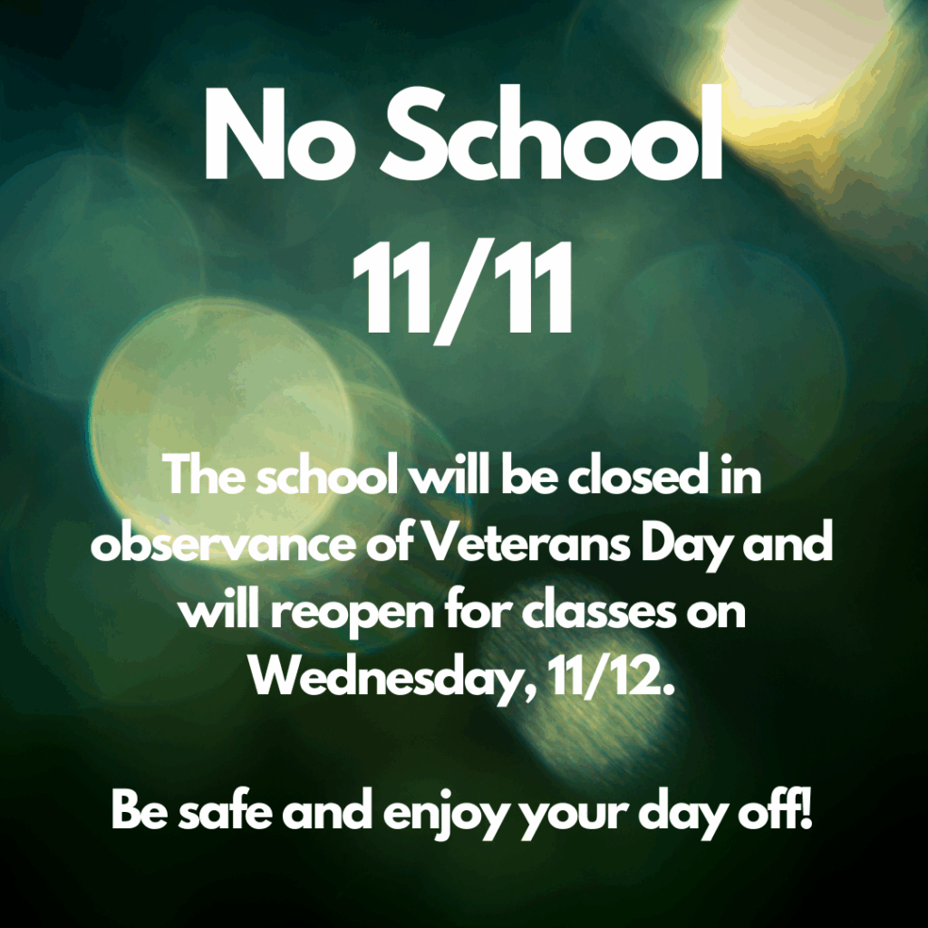 A reminder that the school will be closed on Tuesday, November 11, in observance of Veterans Day. Be safe and enjoy your day off!