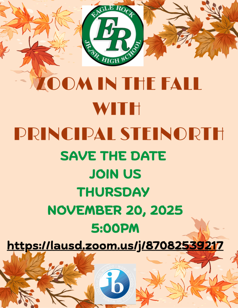 Be sure to drop by for an evening cup of Coffee with our Principal, Mr. Steinorth, this Thursday, 11/20, at 5:00 PM via Zoom. https://lausd.zoom.us/j/87082539217
