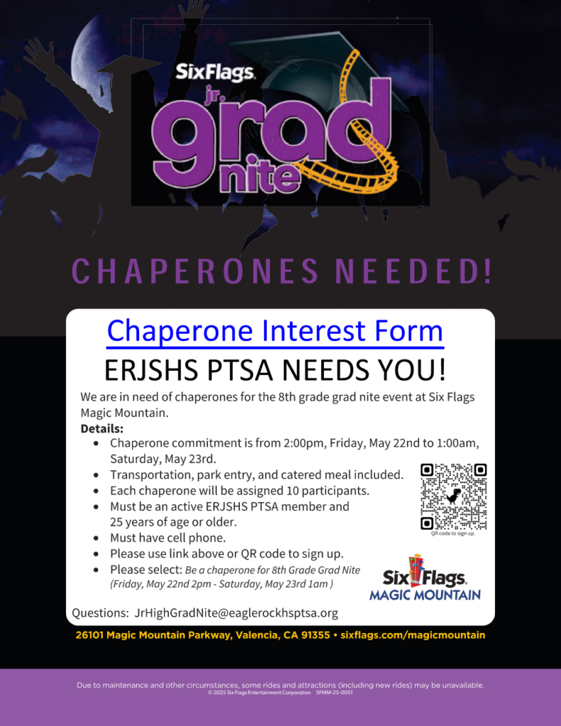 Our 8th Grade Grad Nite event is approaching, and we’re looking for chaperones. Click here if you are interested, or scan the QR code in the flyer below. Email JrHighGradNite@eaglerockhsptsa.org for more information. Thank you!